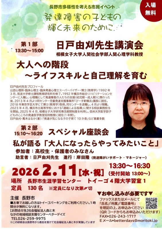 来る2月11日に長野市主催で、「発達障害の子どもの輝く未来のために」という題目で、第1部は日戸由刈先生の講演会、第2部はスペシャル座談会(参加者は高校生と保護者の皆さん、進行役は自分も評議員をさせて頂いております「社会福祉法人 森と木」(障害者支援)の理事長である岸田隆氏)が、生涯学習センターで開催されます。お時間ございましたらご聴講願います。