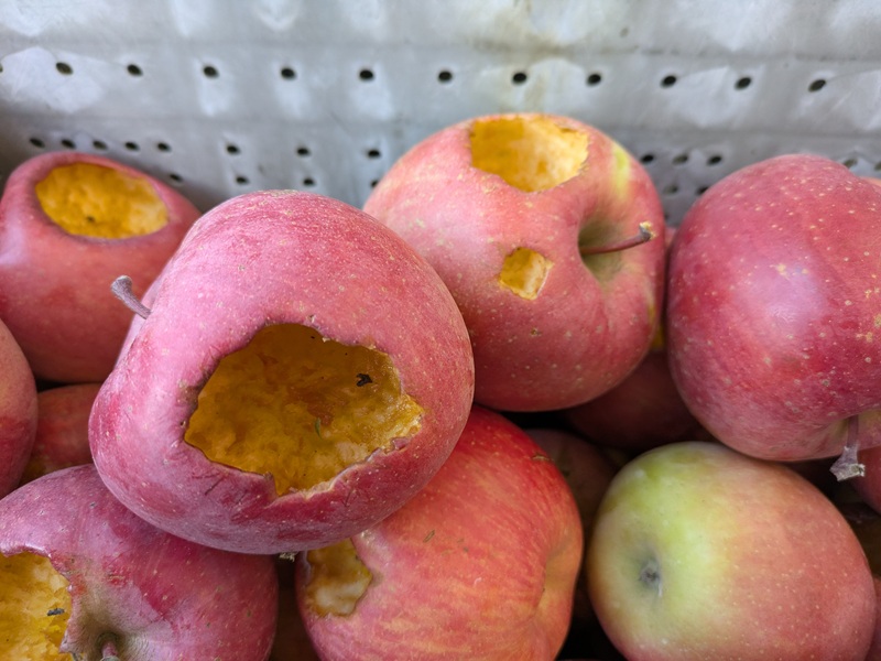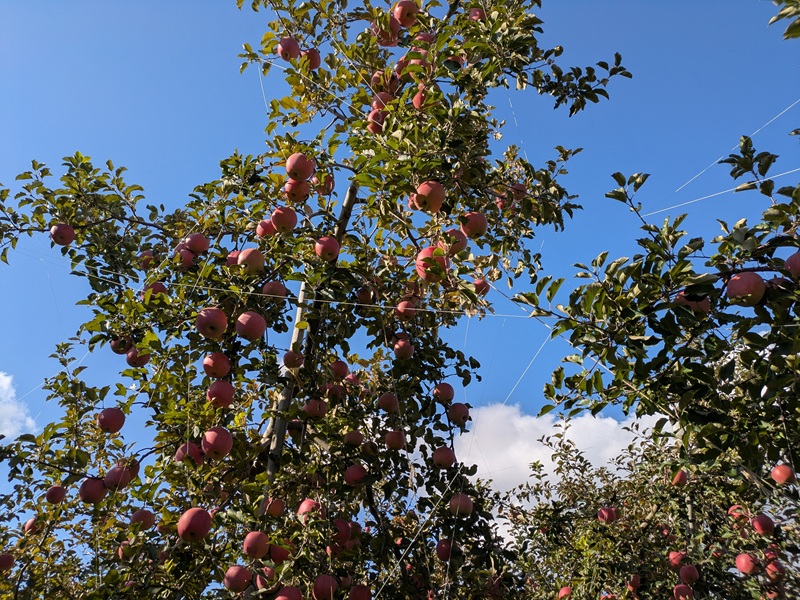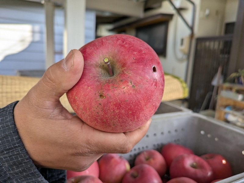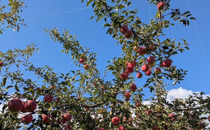 穂保のりんご農家さんから、鳥害がひどいので見に来て欲しいと連絡があり、伺ってきました。りんごは木の高いところの実が良く日が当たり、美味しいとのことですが、ヒヨドリやムクドリがそこのりんごを食べたり突っついたりして、かなりの被害がでていました。