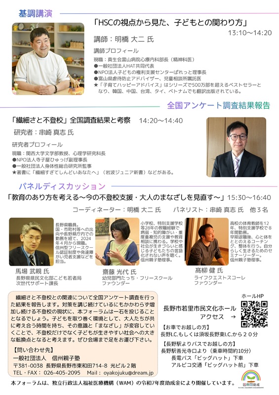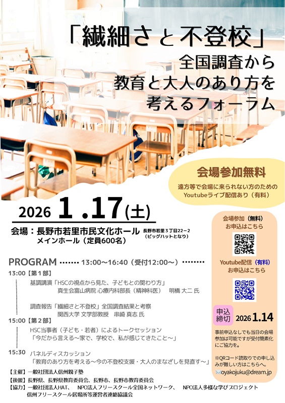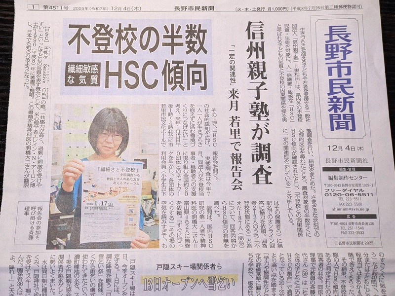 また、別の選択肢としてはいわゆるフリースクールが市内にいくつかあります。 自分も「信州親子塾」というフリースクールを顧問として支援していますが、その親子塾が主催で1月17日にフォーラムを開催します。今回はHSC(Highly Sensitive Child、ハイリー・センシティブ・チャイルド、「非常に敏感な子」)がテーマで、この分野では著名な明橋大二先生の講演やパネルディスカッションがあります。悩んでおられる方はご参加を。