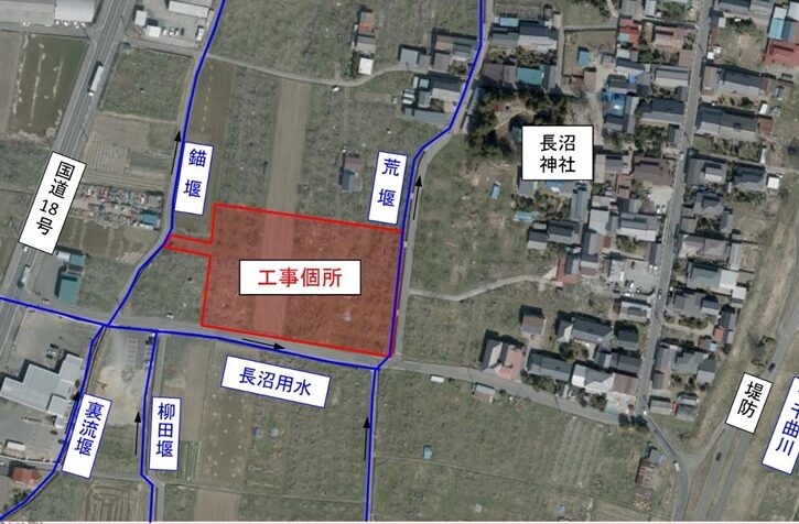 前回は塩崎遊水地という大規模な遊水地の報告でしたが、今回はそれより容量の小さい(と言っても、東西約90m、南北約55mと、そこそこのサイズですが)「長沼雨水調整池」についてです。長沼雨水調整池は国道18号と千曲川堤防の間、長沼神社付近に設置中です。