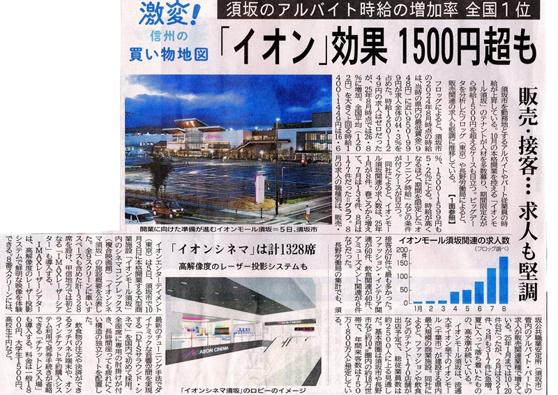 添付画像は、数日前の信毎記事と信毎に入っていた新聞の折り込みチラシです。既に話題になっているのでご存知かと思いますが、「イオン効果」で人件費、特にパートさんの給与が上がっています。 上がるだけでなく、須坂で2500人を雇うというイオンに人員が引き抜かれています。自分が顧問をしている福祉施設でも2人ほどイオンに持ってかれました。時給で2~300円違ったら競争になりません。働く人にとっては良いのでしょうけど。