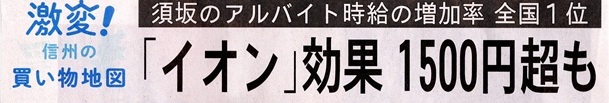 添付画像は、数日前の信毎記事と信毎に入っていた新聞の折り込みチラシです。既に話題になっているのでご存知かと思いますが、「イオン効果」で人件費、特にパートさんの給与が上がっています。 上がるだけでなく、須坂で2500人を雇うというイオンに人員が引き抜かれています。自分が顧問をしている福祉施設でも2人ほどイオンに持ってかれました。時給で2~300円違ったら競争になりません。働く人にとっては良いのでしょうけど。